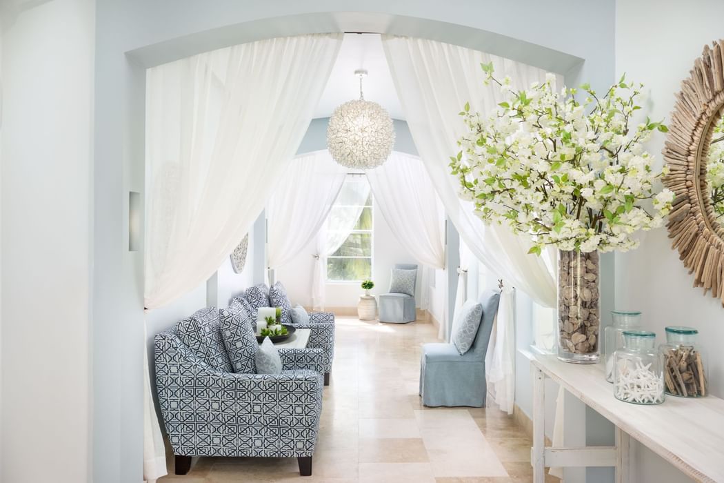 Drift Spa entrance with flowing white curtains, a decorative heron, and a cozy seating area at Windsong Resort On The Reef